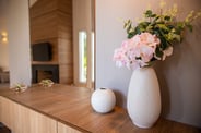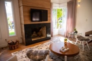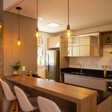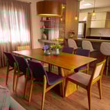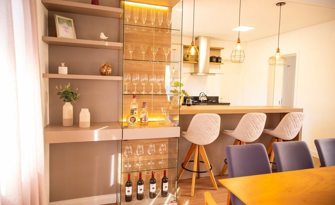 O projeto de interiores foi pensado para ser aconchegante, elegante e muito conectado com o frio da serra gaúcha. Elementos como madeira, tapetes, cortinas e almofadas ajudam a deixar o ambiente com cara de casa. Os tons mais neutros foram utilizados nos móveis para agradar de maneira geral que utilizasse a casa.