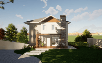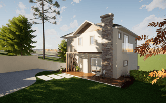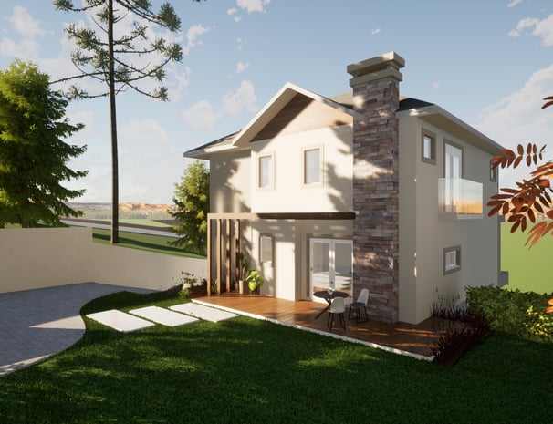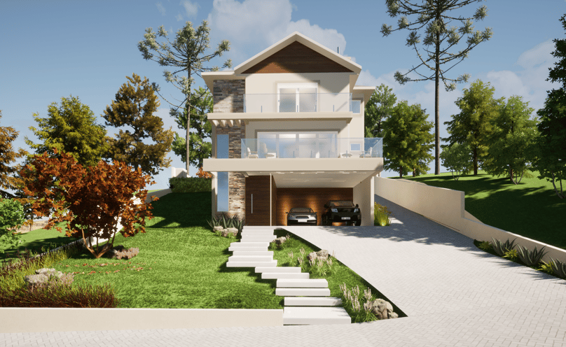 Esta casa conta com 4 suítes, sendo 1 master com banheira. Nesta projeto com terreno em aclive, a área social foi disposta no segundo pavimento, o que proporciona uma vista incrível para o vale.